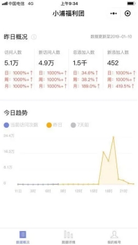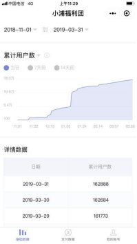 2、2018年11月1日首次发布, 截至2019年3月31日,小浦福利团新增用户数量达到162888名。