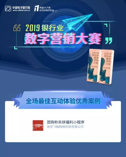 今日,“2019银行业数字营销大赛 ”落下帷幕,在众多银行与数字营销企业的数字营销案例中,南京飞翰凭借 “团购秒杀拼福利小程序 ”,以数字渠道为核心,通过公益内容和活动,与客户进行沟通的品牌营销案例斩获 “全场最佳互动体验优秀案例 ”奖项。