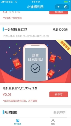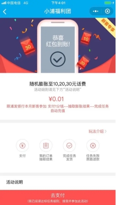 一分钱膨胀红包:拼团购物类似,组团后支付一分钱即可领取膨胀红包,红包将根据当月完成任务情况,于次月发放。,通过先支付再完成任务的方式引导用户完成对应营销目标,同时这里的支付可以限制必须使用微信支付绑定的浦发银行借记卡或者信用卡。